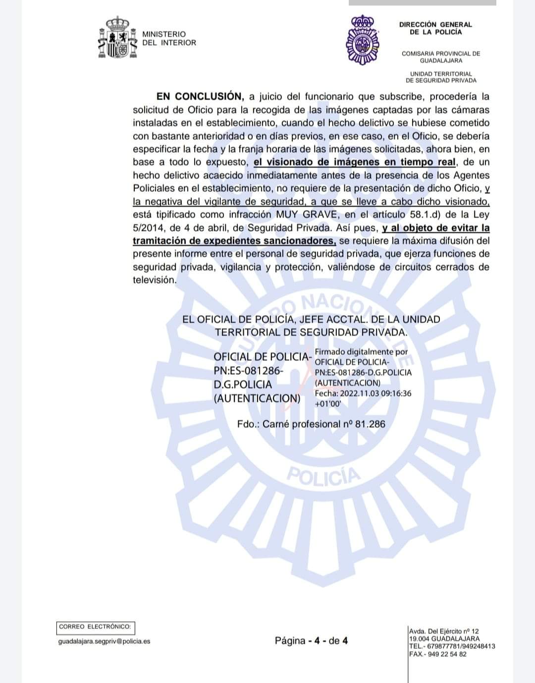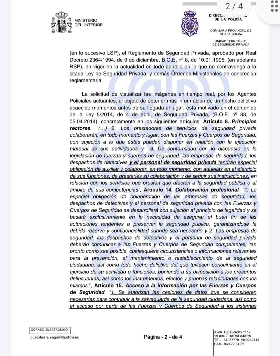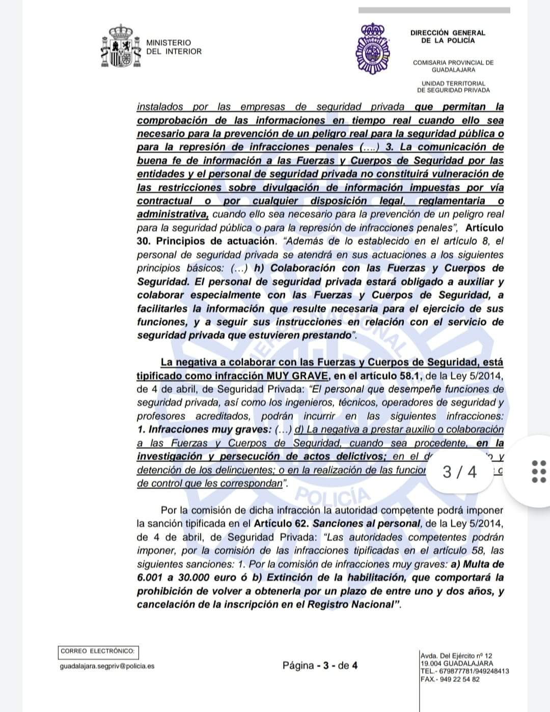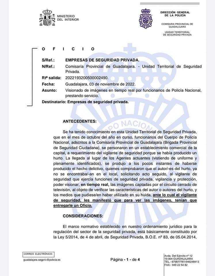 (Por SoySeguridadPrivada) – Se ha emitido desde Cuerpo Nacional de Policía de Guadalajara un comunicado a las empresas de seguridad y sus trabajadores, sobre una incidencia ocurrida tras un posible hurto en un centro comercial. El Vigilante de Seguridad que allí prestaba servicio no accedió a mostrar los vídeos de CCTV del hurto a dos policías que se acababan de presentar uniformados e identificados, con la intención de obtener información del probable delito.